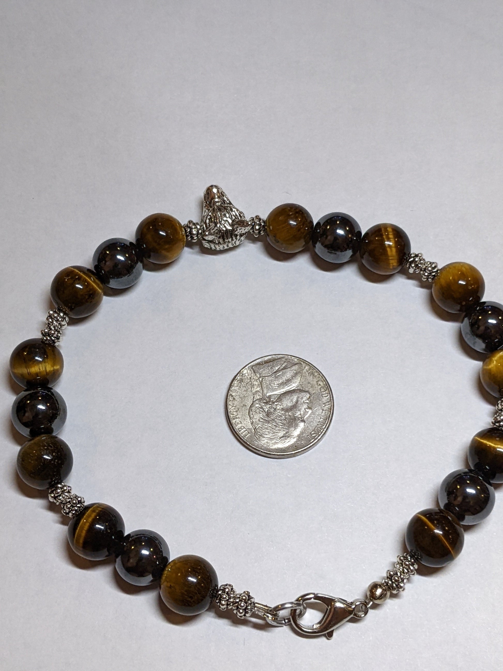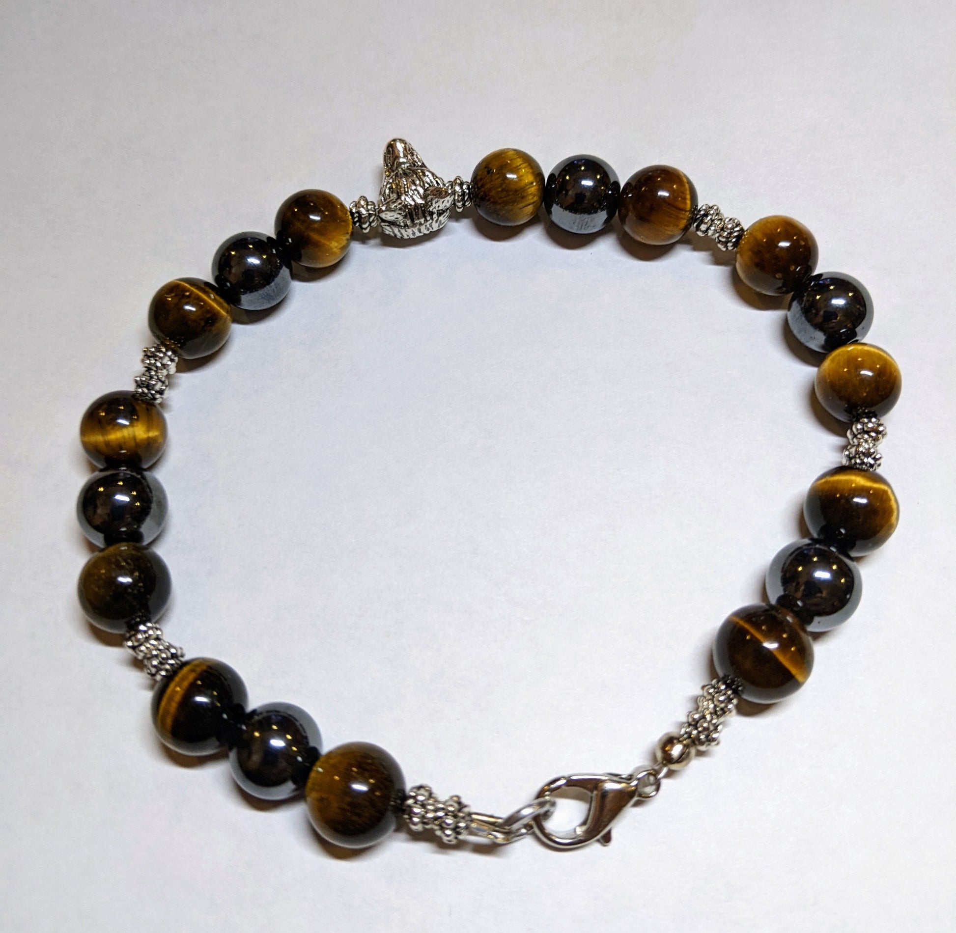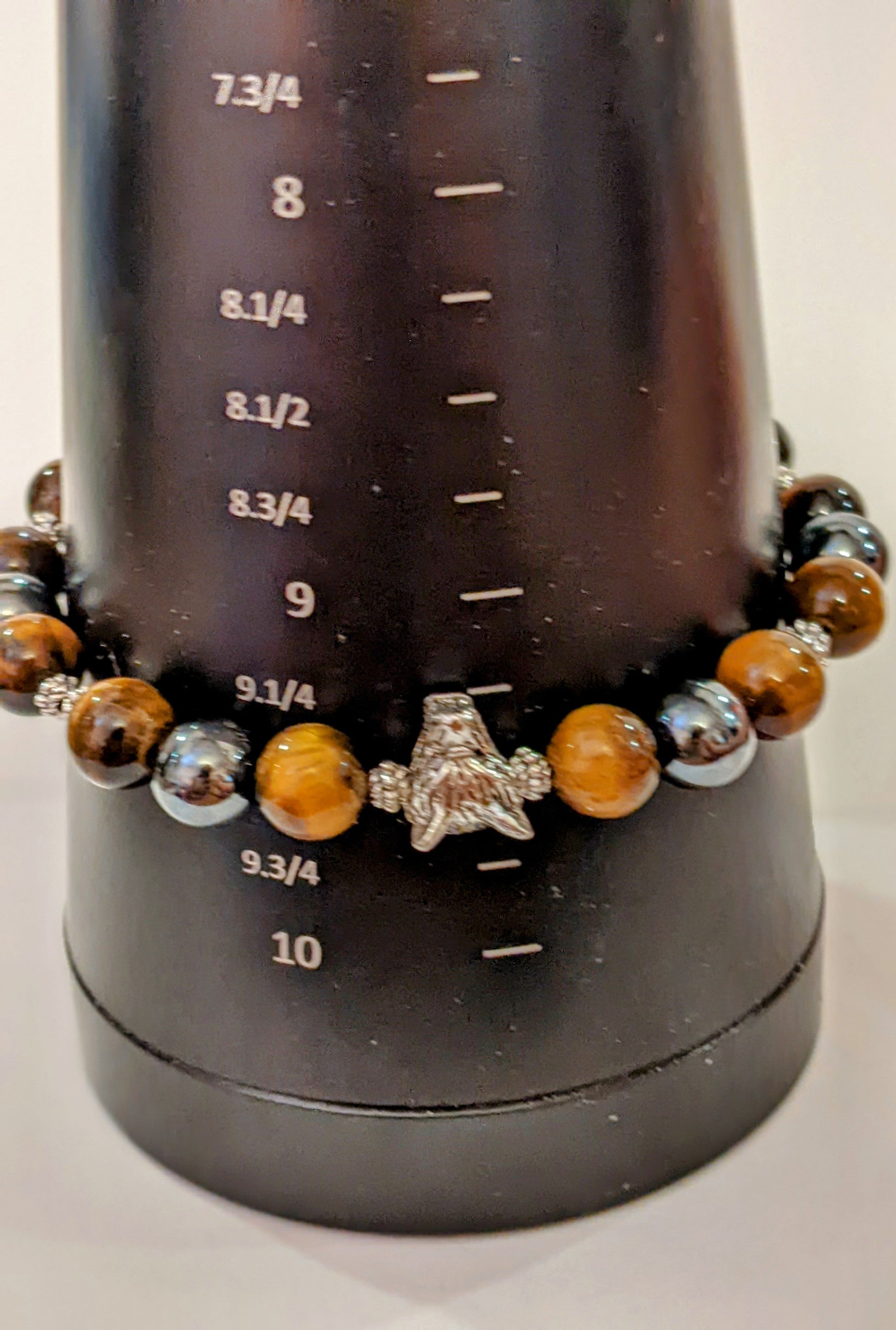 Take command of your style with Canus Lupus, featuring stunning large gemstones of tiger eye and hematite surrounding a powerful wolf head focal. Step up for adventure and make a bold statement with this striking bracelet.