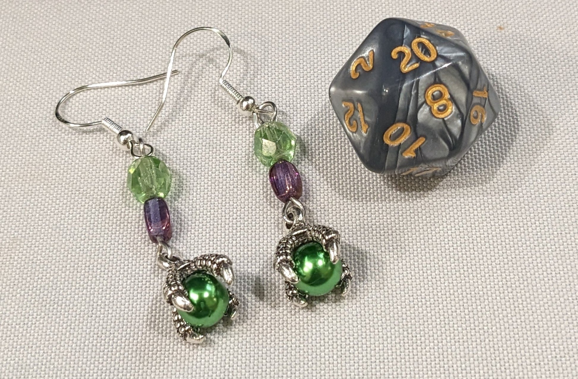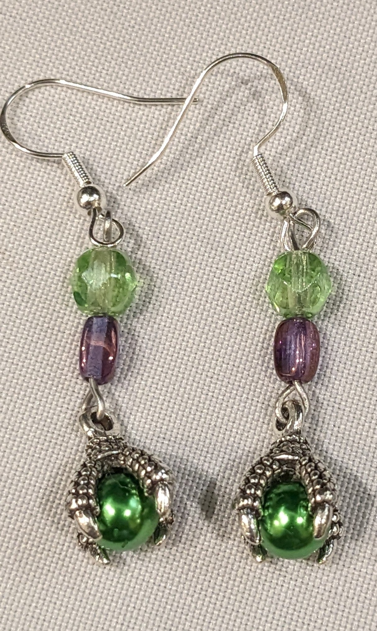 Take your style to new heights with these fantastic Dragon Claws! Featuring Czech glass accents in bold purple and green, this eye-catching earring will make a statement wherever you go. Climb dragon-back and fly away in style!
