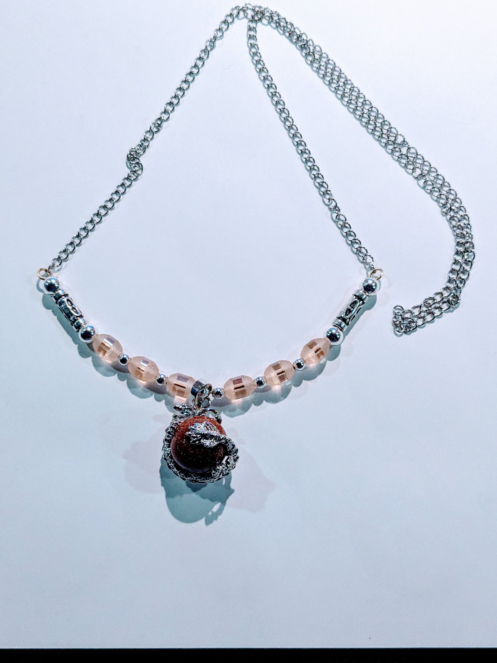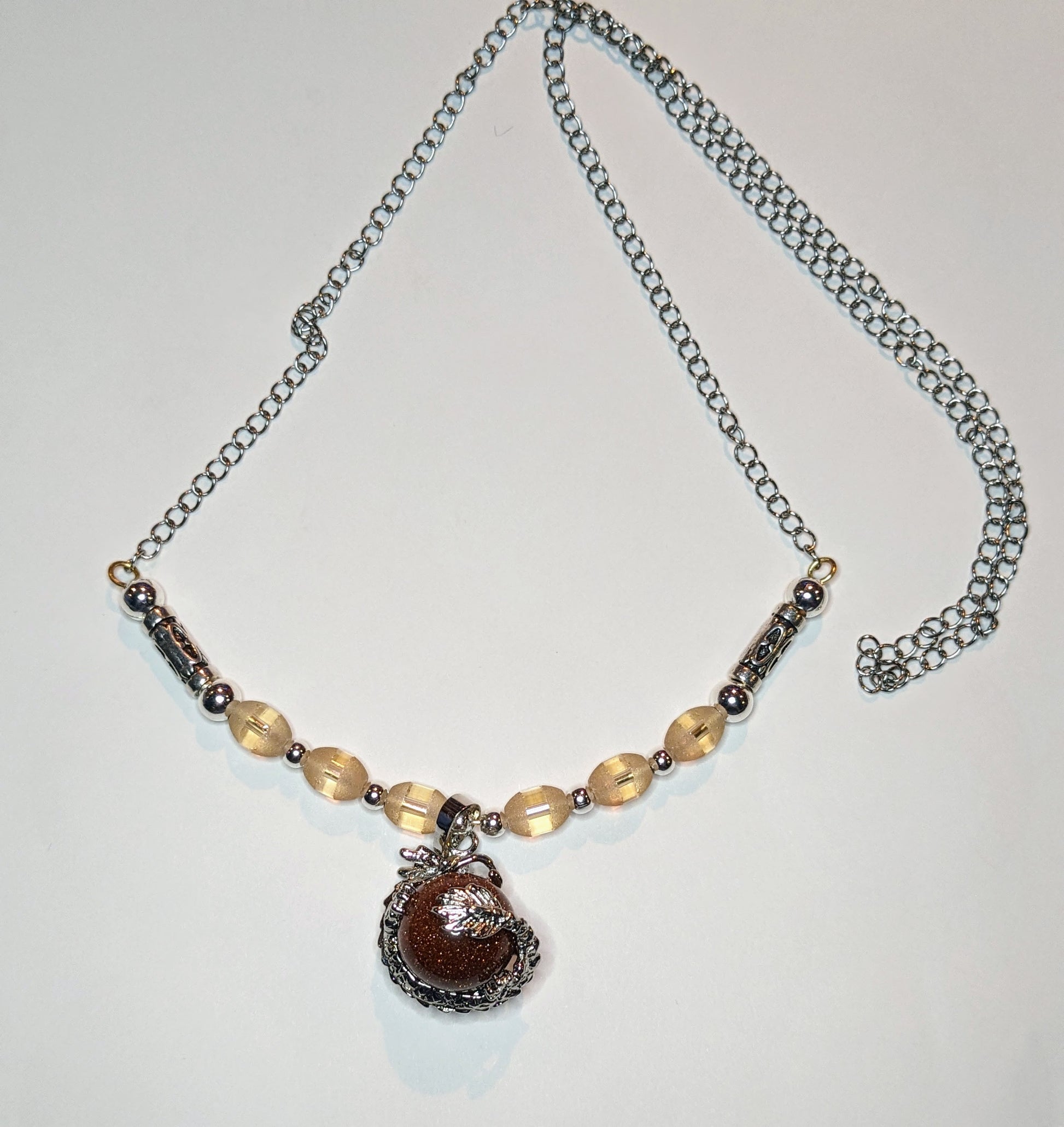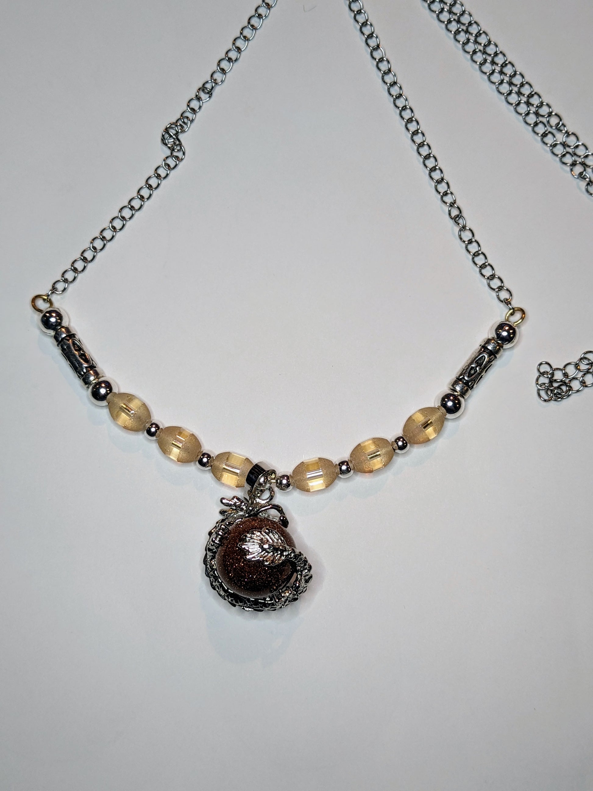 Unleash your inner fantasy with our Goldstone and Dragon Pendant Necklace! This stunning piece features a captivating dragon pendant, symbolizing strength and courage, on a beaded necklace. Perfect for adding a touch of whimsy and mystery to your look. Elevate your style with this unique accessory.