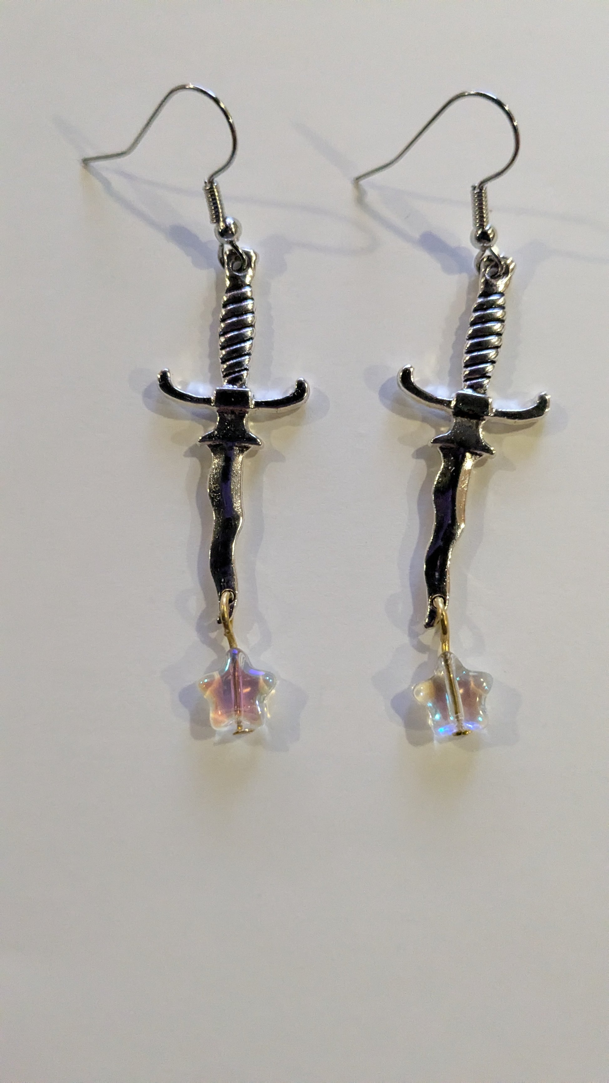 Add a touch of magic and sparkle to your outfit with our Magical Dagger Dangle Earrings! Featuring iridescent crystal stars that will catch everyone's eye. These earrings are perfect for adding a whimsical touch to any look. (Sparkle on, you enchanting fashionista!)