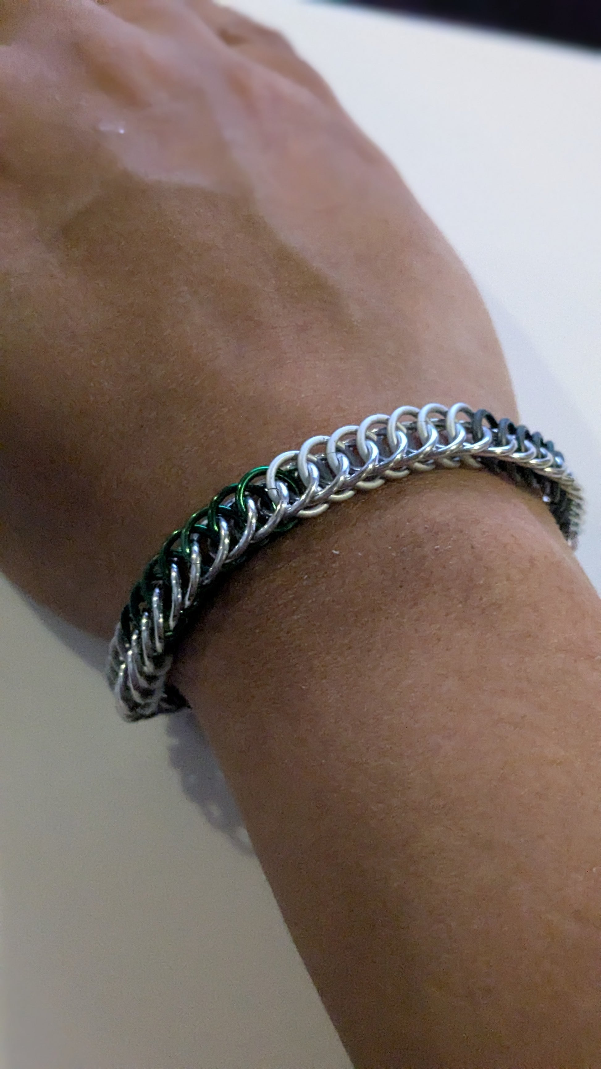 Pride chainmail bracelets. 3-in-1 half persian weave from anodized aluminum rings. Will not tarnish and light enough to wear all day. Suitable for all genders and ages. Looks great with any outfit! 8 inches long.