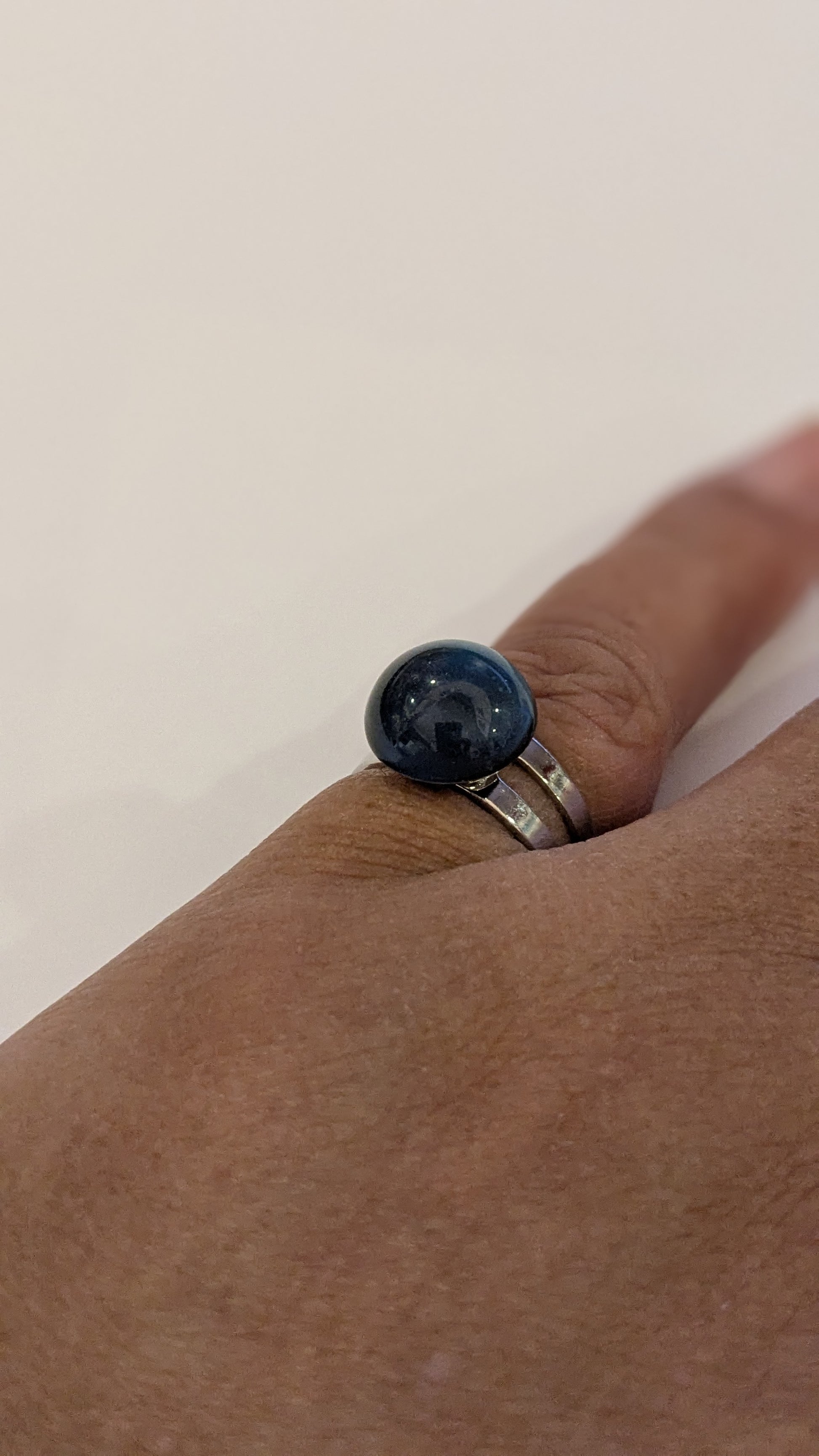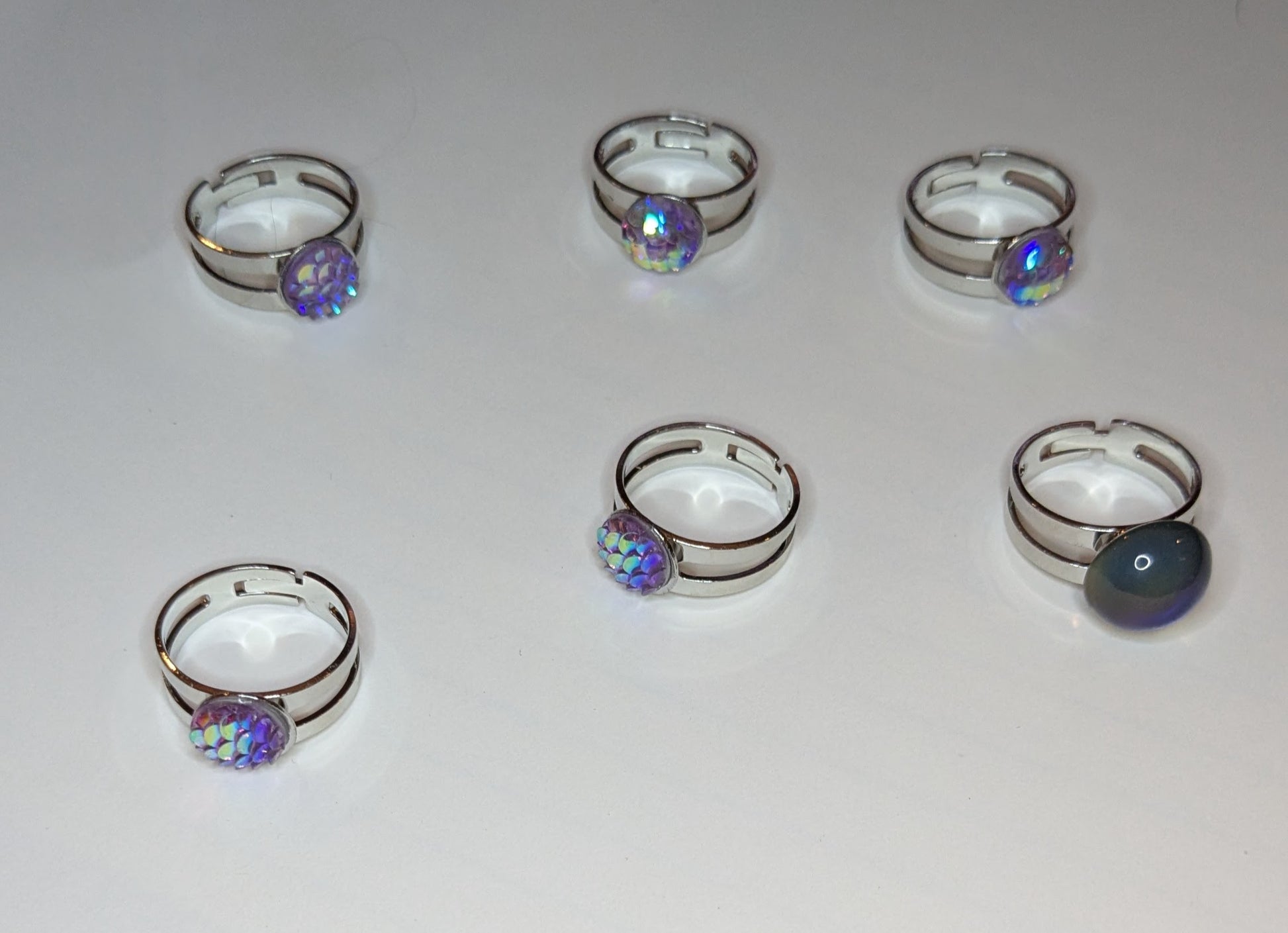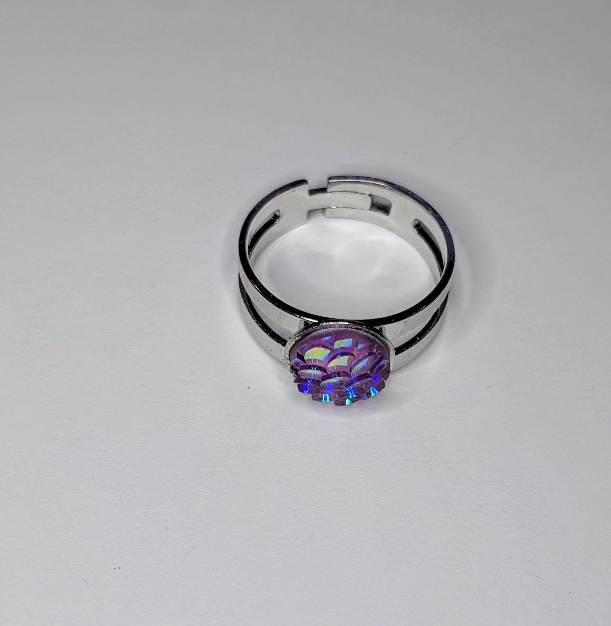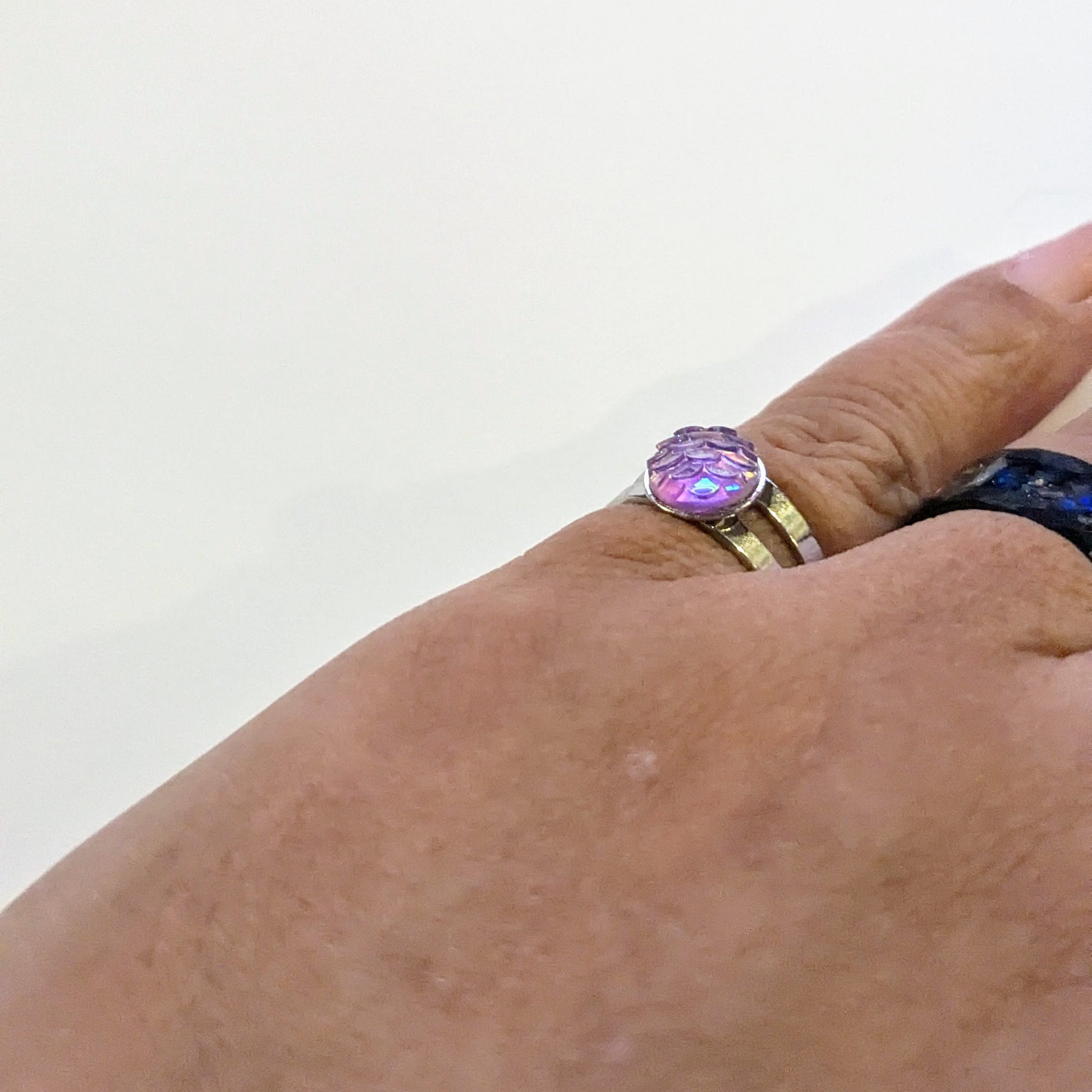 Stainless steel adjustable rings with sparkly mermaid/dragon scales or mood stone cabochon. The ring goes from about US size 5.5 to 9.5.