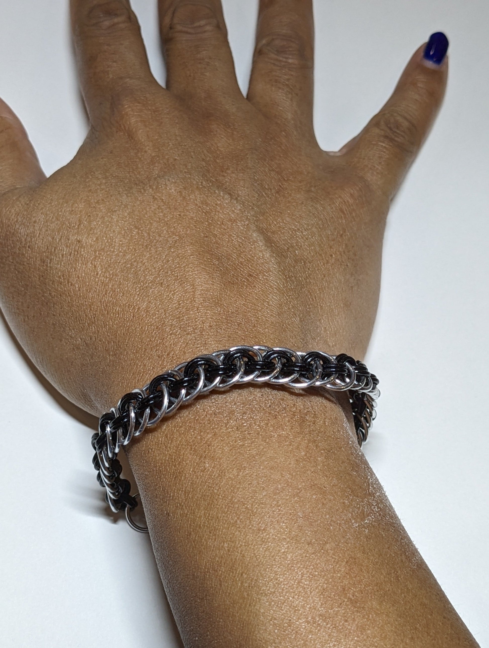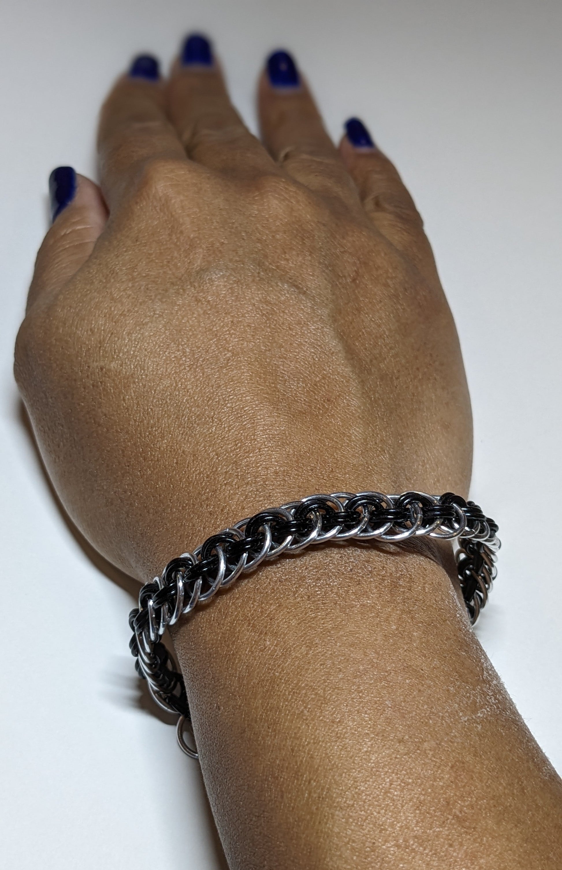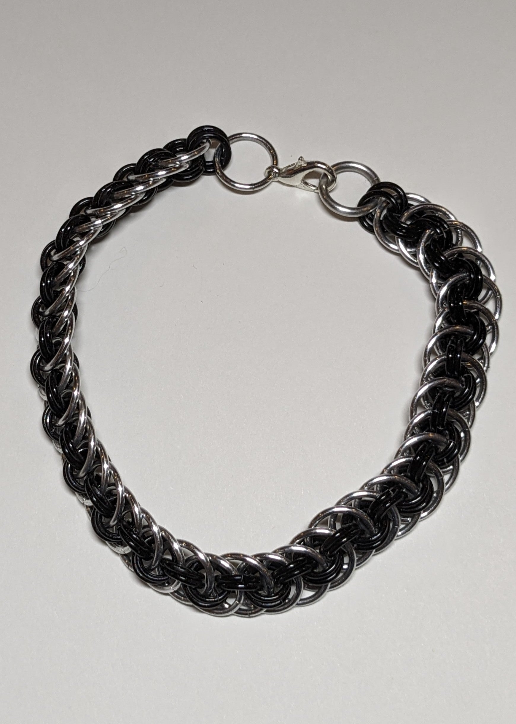 Handcrafted viper weave chainmail bracelets. The lightweight anodized aluminum rings don't tarnish and are easy to wear. Suitable for any gender or age. Choose between pink, sky blue, black ice, black or rainbow pride. Lobster claw clasp. Approx. 8 inches long