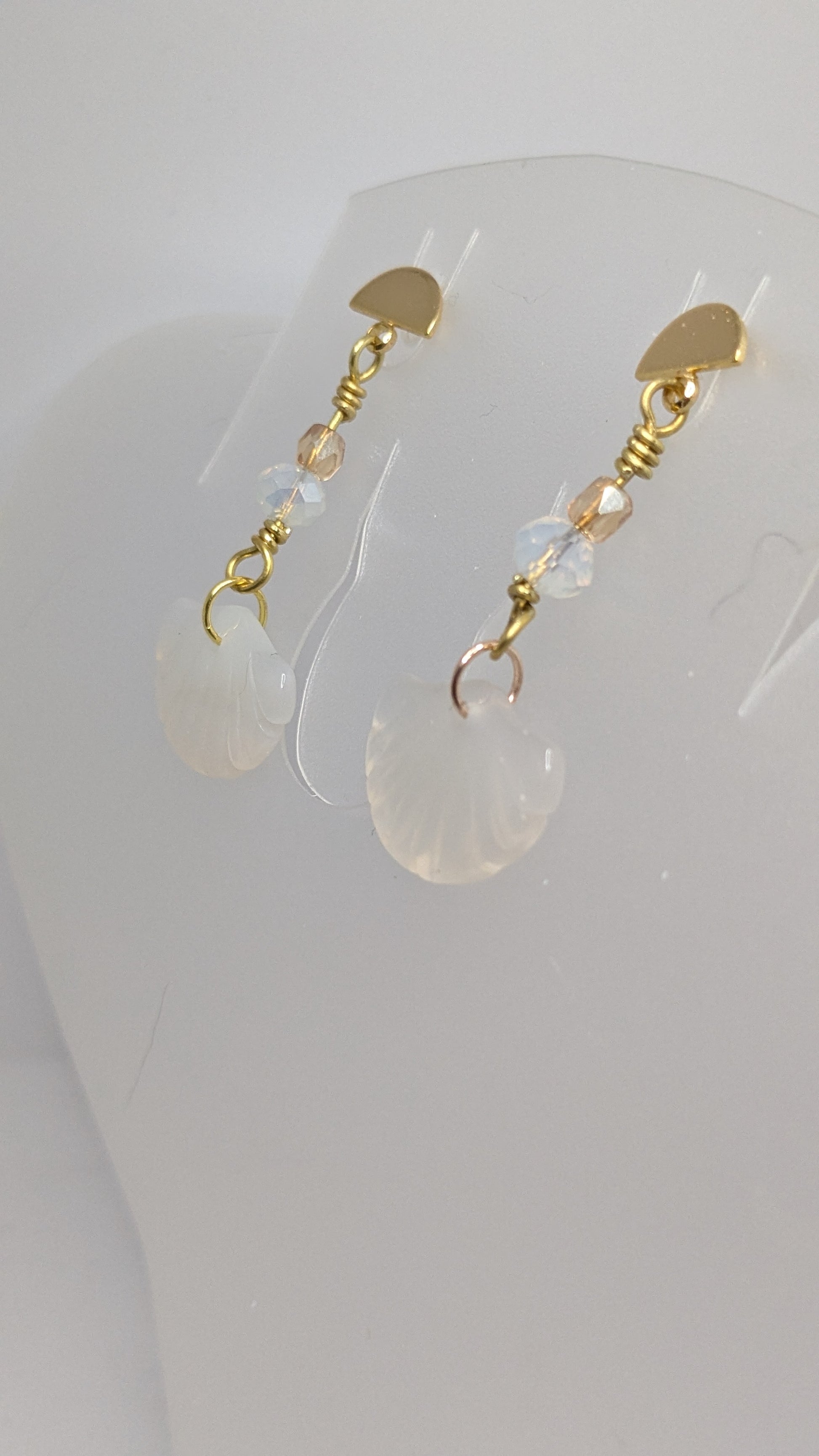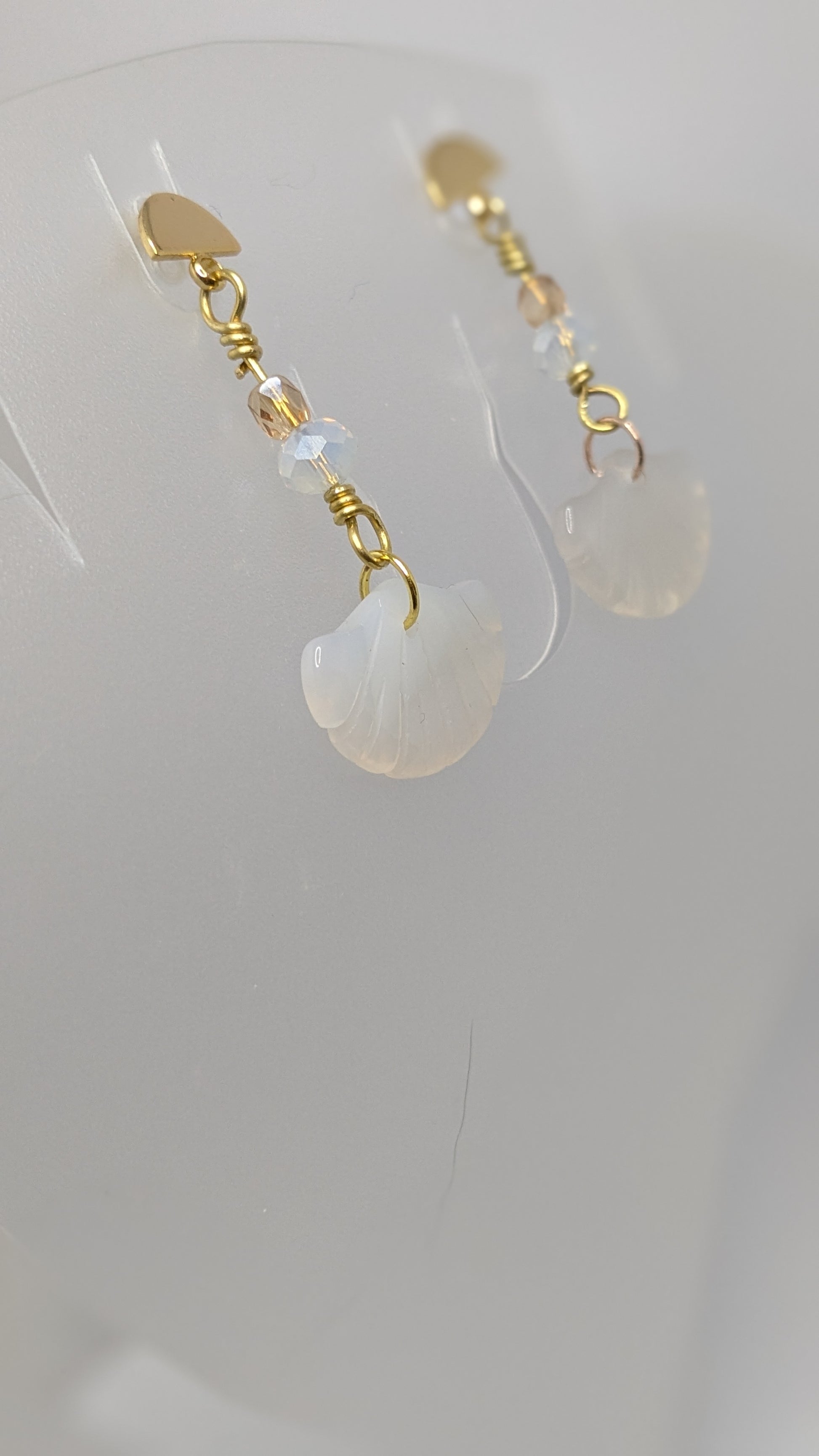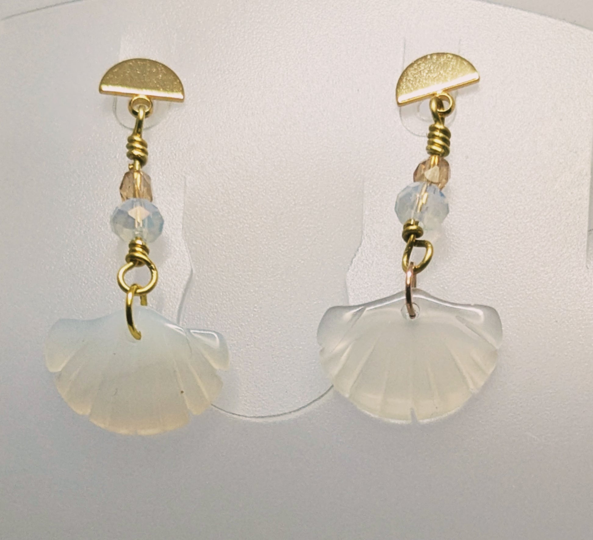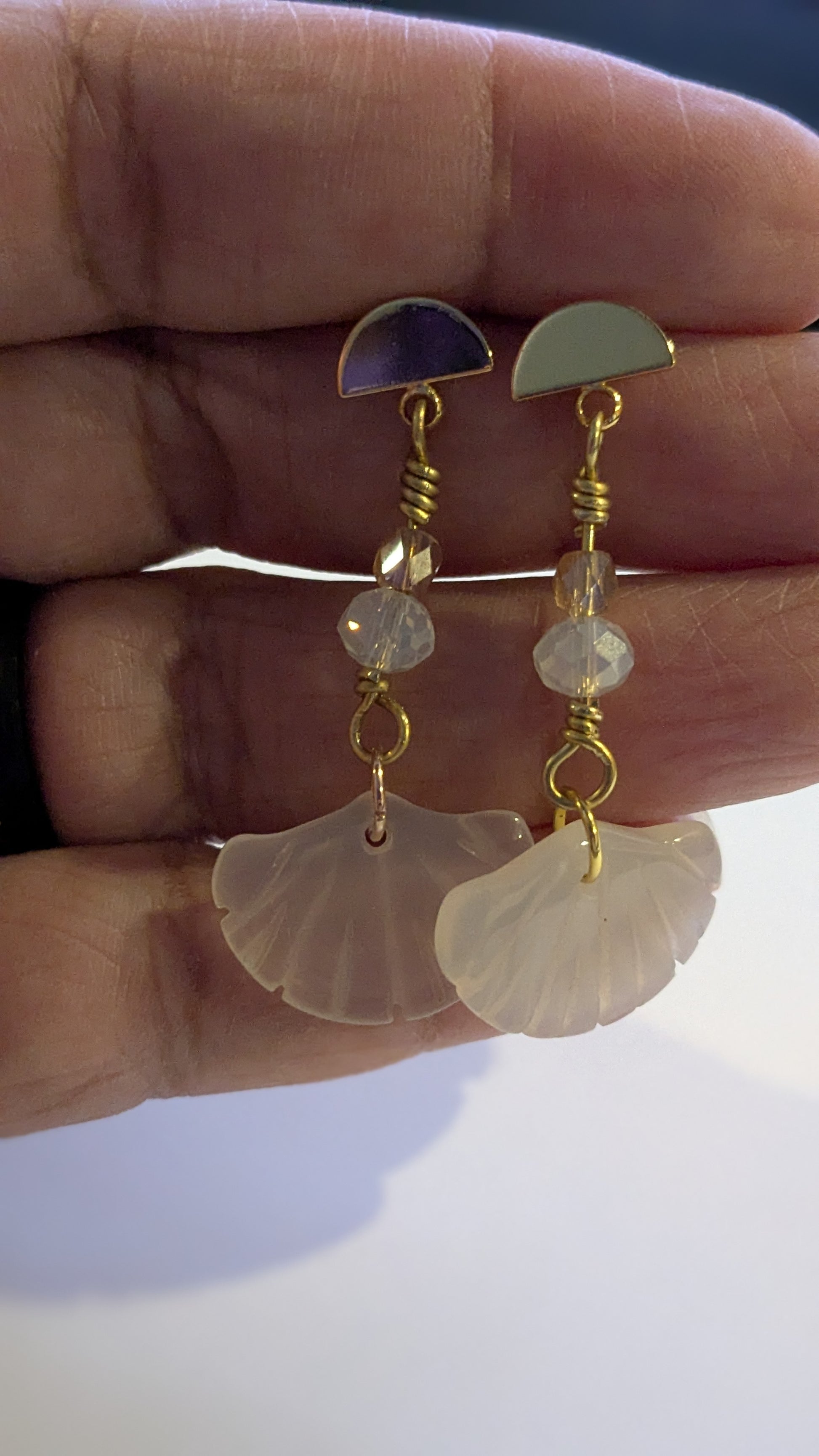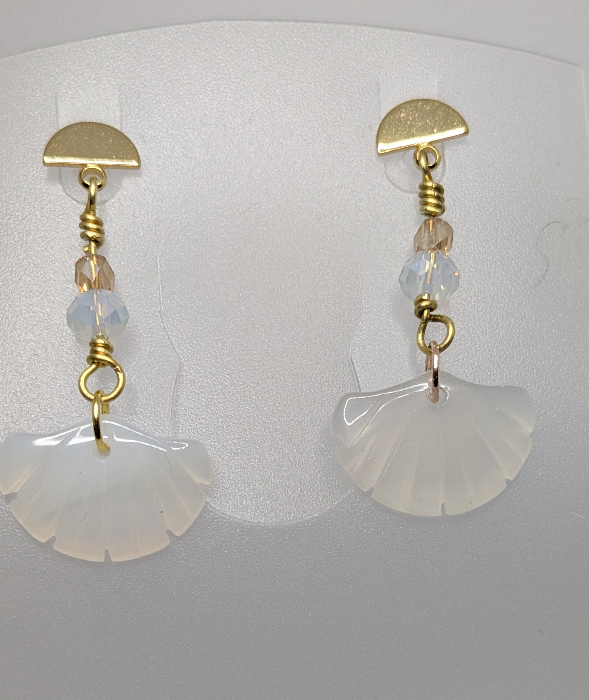 Elevate your elegance with these White Agate Ginkgo Leaf Dangle Earrings. Expertly carved white agate leaves are complemented by shimmering faceted crystals, all suspended from refined gold-plated half-moon studs. This sophisticated design offers a graceful blend of natural beauty and timeless luxury, perfect for any occasion that calls for subtle yet striking style.