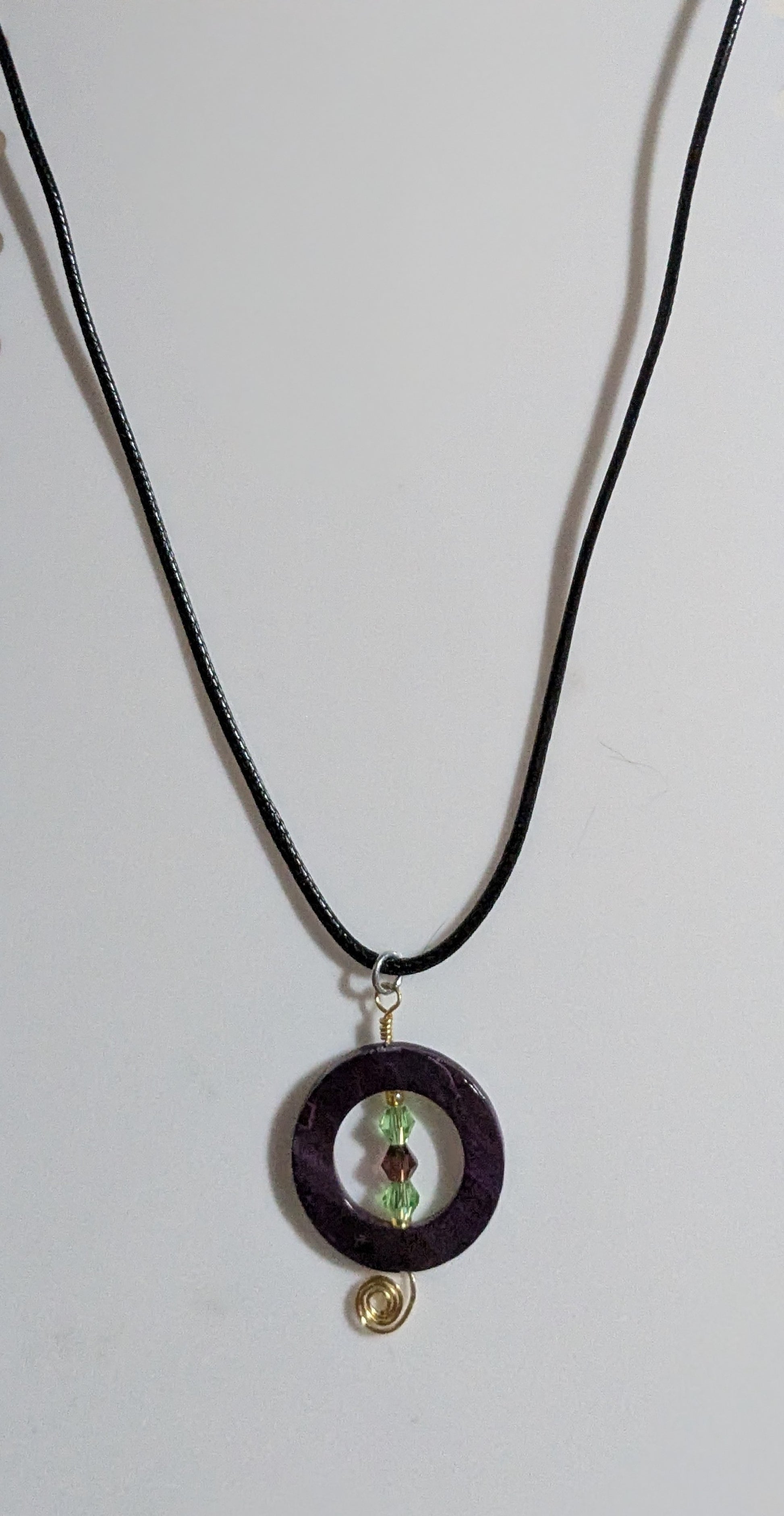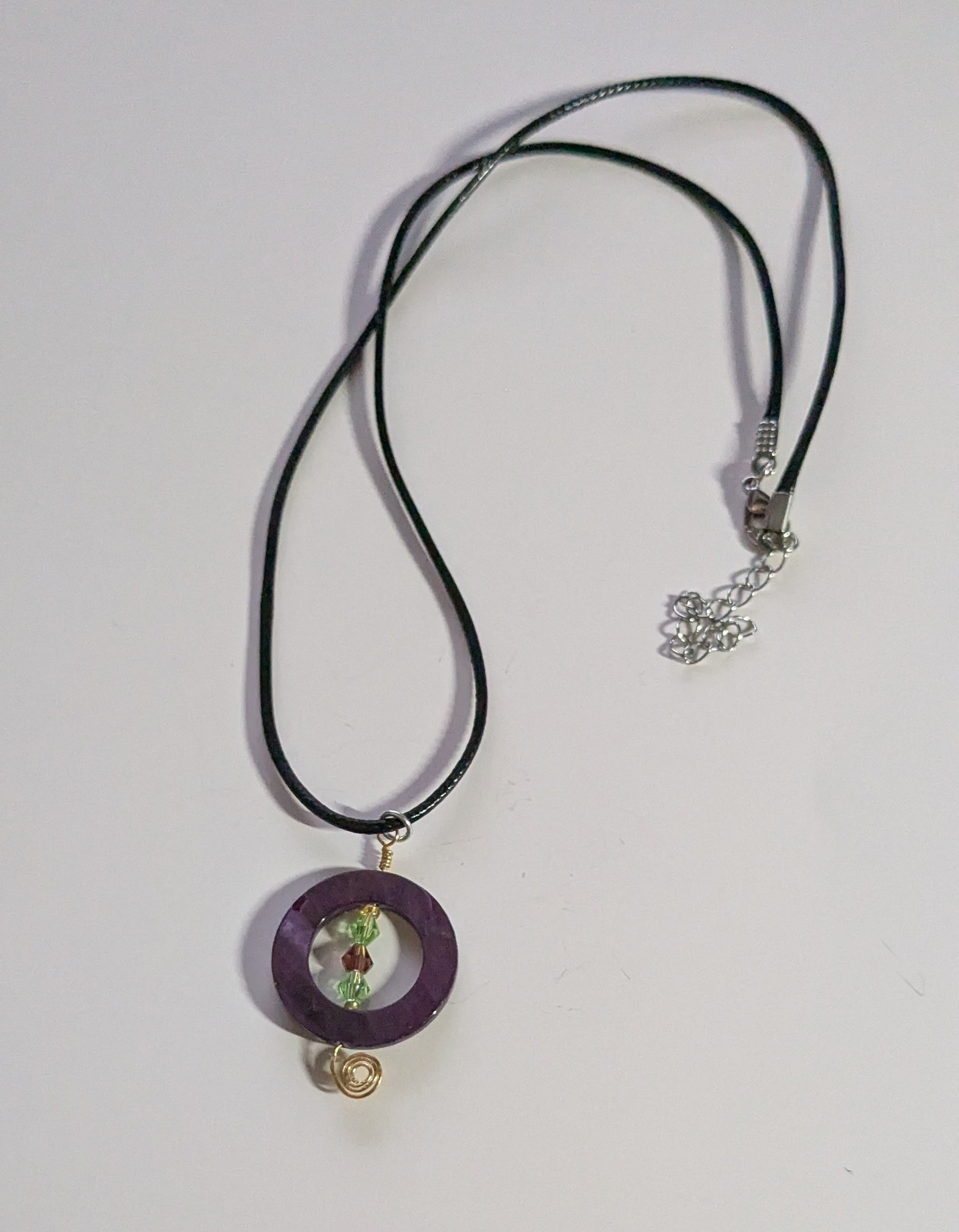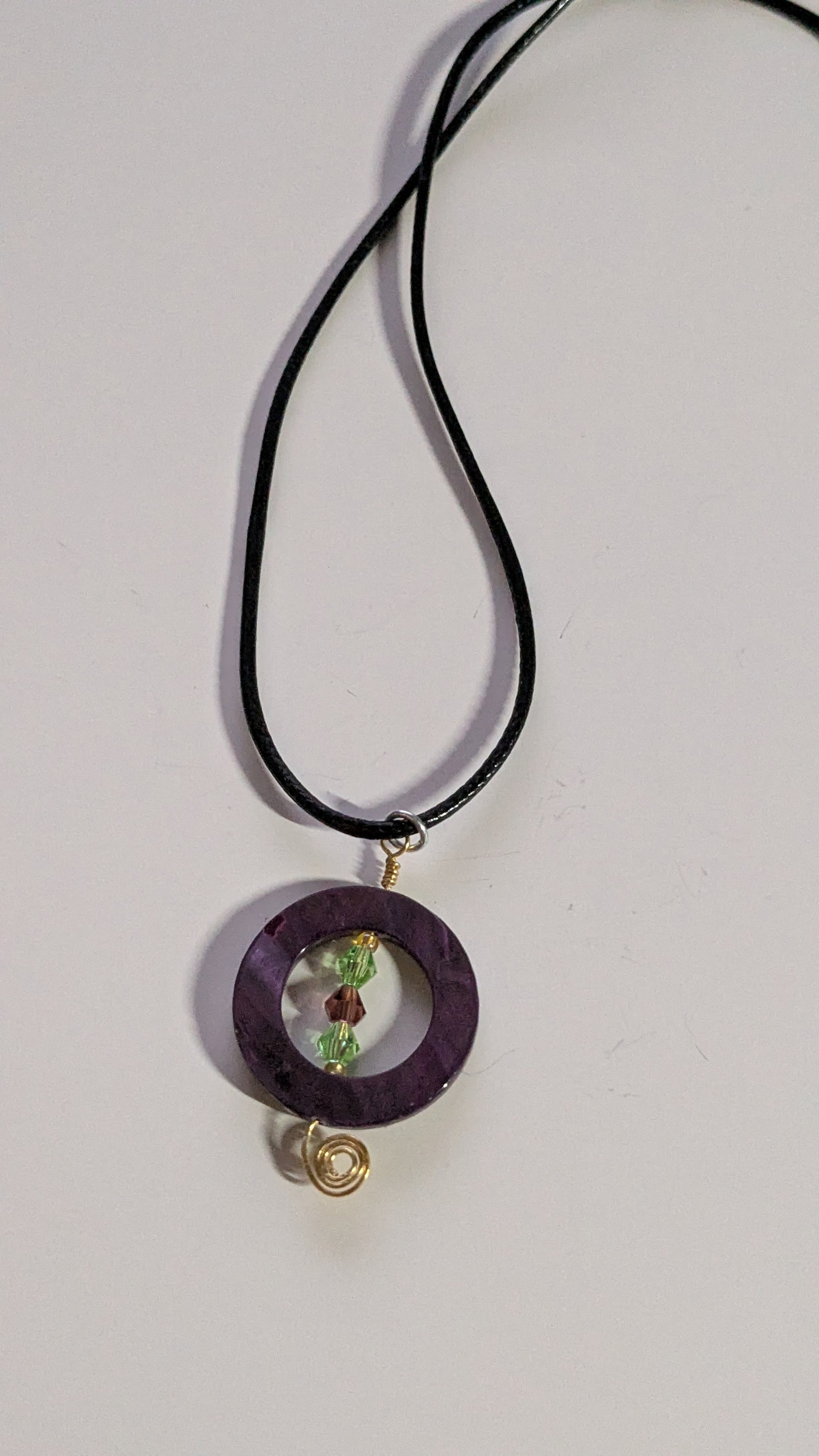 Elevate your style with this stunning pendant featuring a vibrant purple dyed shell. Accented with sparkling crystal beads, it offers a unique blend of natural beauty and artisan craftsmanship. Perfect for adding a touch of elegance and color to any outfit, this pendant is a captivating accessory that draws attention and complements your individuality.